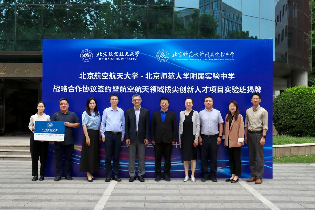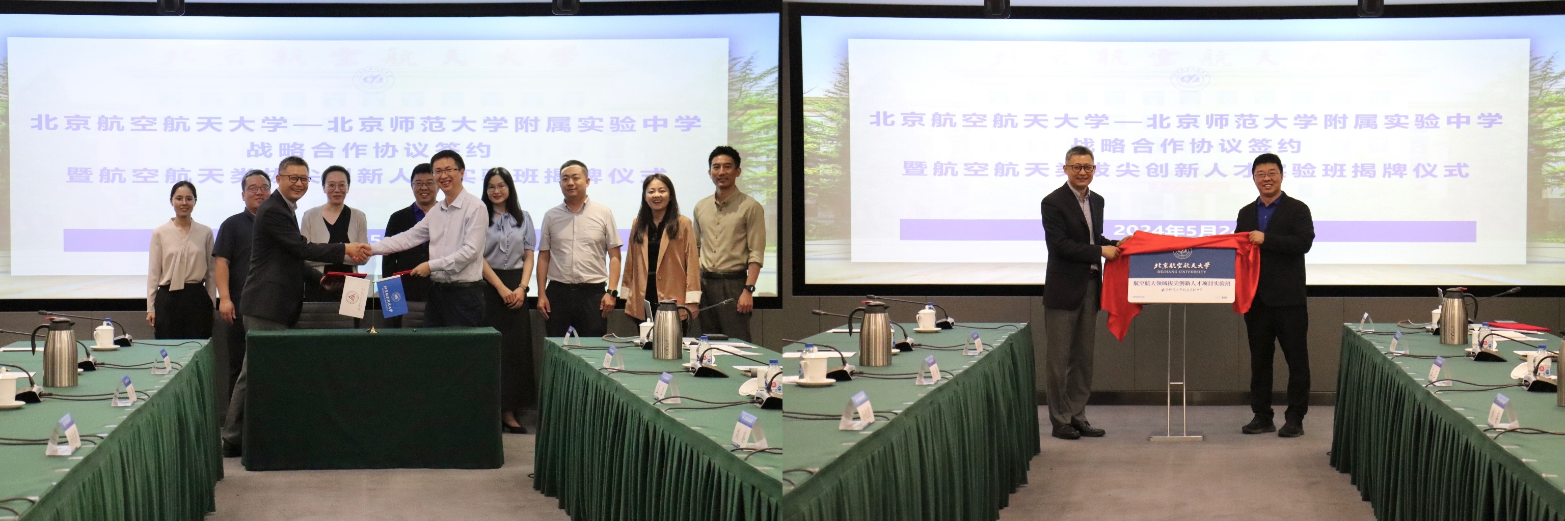 刘虎与孙兆前代表双方学校签署《永利官网—北京师范大学附属实验中学战略合作协议》,刘睿与孙兆前共同为“永利官网—北京师范大学附属实验中学创新人才实验班”揭牌。双方本着“优势互补、合作共赢、人才共育”的原则,整合各自优势资源,创新高校与中学联合人才培养模式,将大学航空航天特色和中学人才培养需求有机衔接,在科技创新实践、拔尖创新人才培养等方面深度融合、双向奔赴,为实现拔尖创新人才大-中贯通培养探索新途径新模式,为建设教育强国、科技强国和人才强国作出更多更大的贡献。