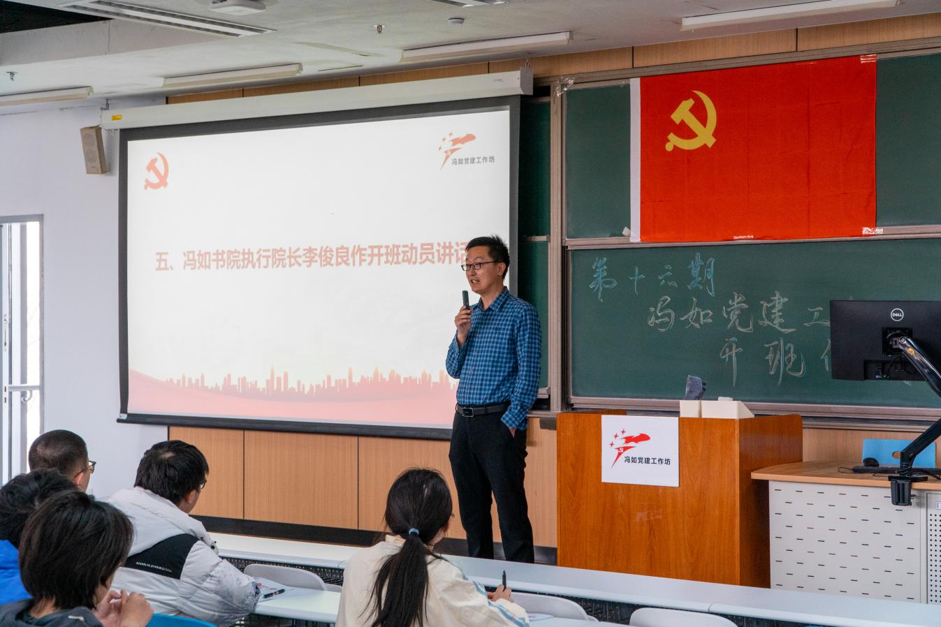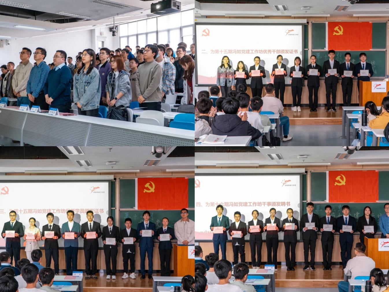 在激昂的《国际歌》歌声中,开班仪式拉开帷幕。随后,与会各位领导老师分别为第十五期冯如党建工作坊优秀干部、优秀学员颁发证书,并为第十六期冯如党建工作坊干事代表颁发聘书。
