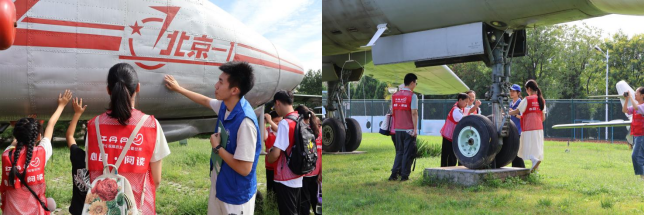“小朋友们,现在咱们摸到的是‘北京一号’的机翼,它像大鸟的翅膀一样,前端尖、后端宽,1958年北航师生用100天就把它从图纸变成了能飞的飞机,这是新中国第一架高校研制的旅客机 …… ”8月22日上午9时30分,7支小组同步开启“触摸航空”之旅,航空馆外场变成了生动的“空天课堂”。