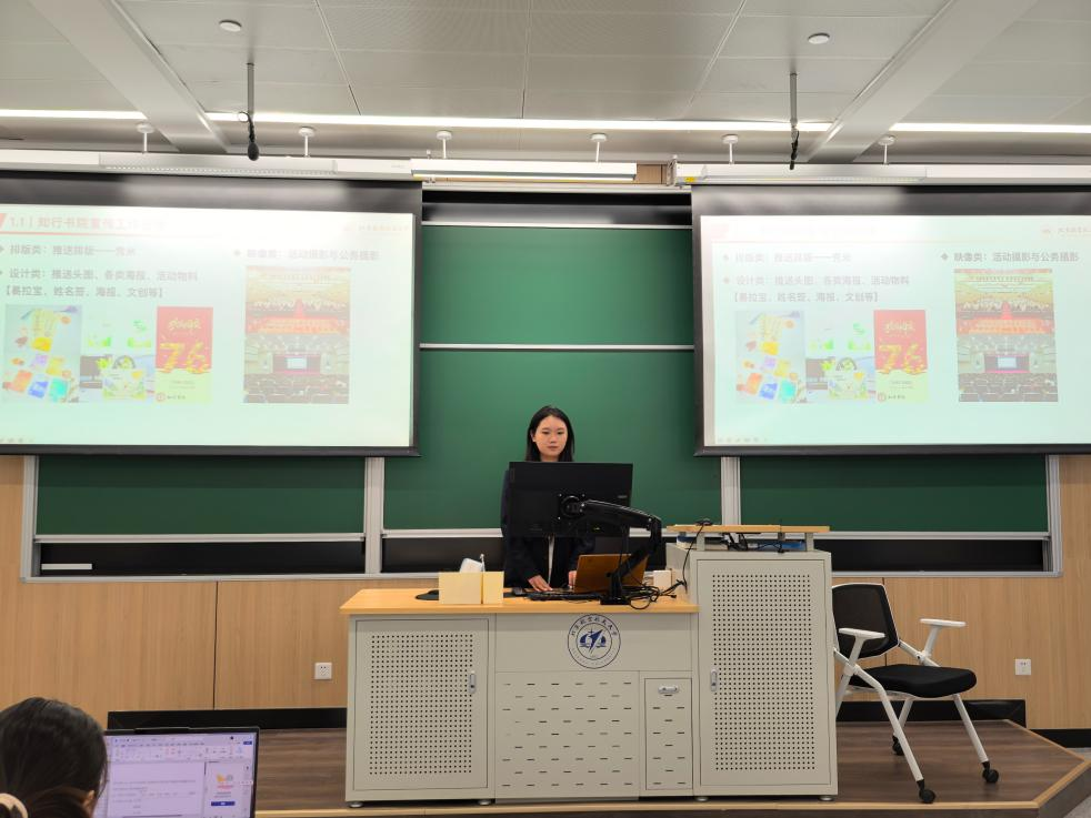 书院分管宣传工作的半脱产辅导员邹昕冉为知行书院员工骨干进行了宣传通用能力培训。她首先对宣传工作的整体流程进行梳理,强调宣传内容应具备原创性和严谨性,并提醒同学们要辩证地运用AI工具。随后,她围绕文案撰写、排版设计、海报与文创设计、摄影摄像等四个方面进行了详细讲解,要求文案应风格得体、表达清晰;排版需兼顾统一性、突出重点及美观性;设计工作要注重合规与视觉效果的统一;摄影摄像则需关注构图、拍摄礼仪及细节把控。最后,她希望员工骨干们能够坚持不懈,讲好知行故事,传播知行声音,进一步提升书院宣传工作的专业化水平和影响力。本次活动不仅为2025-2026学年知行书院“培‘玉’计划”系列研讨课拉开序幕,也为员工骨干们提供了实用的宣传通用技能与辅助工具,帮助同学们更加规范、高效地开展宣传工作。