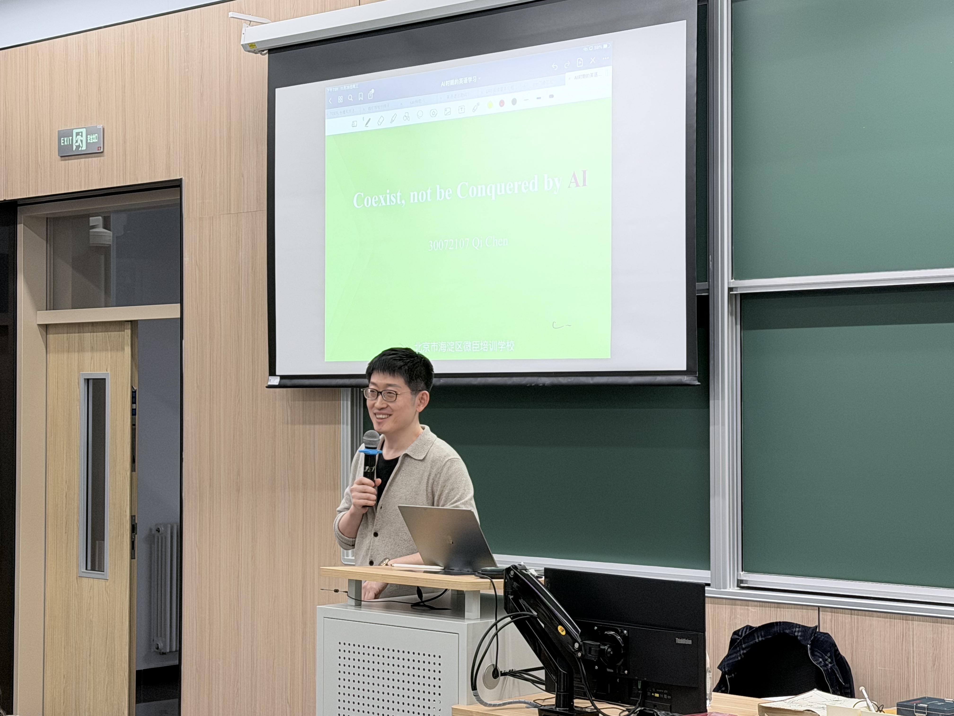 讲座中,陈琦以生动的个人学习经历为引,阐释了英语学习的核心价值与不可替代性。他紧扣AI技术对语言学习带来的变革,系统梳理了学习方法演进脉络,并精准提炼英语学习的三大关键维度——语序、否定与连词,展现出对学科本质的深刻洞察。在互动环节,同学们踊跃提问,现场气氛热烈,形成良好交流氛围。
